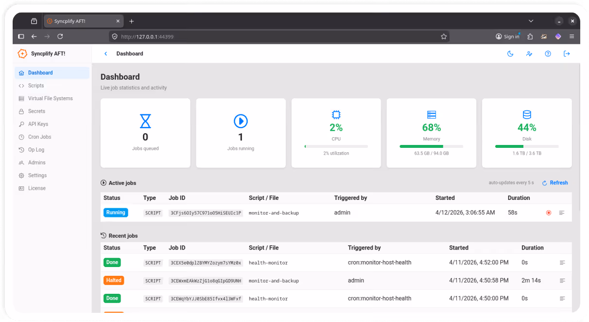 SyncJS is Syncplify's extended scripting engine, built on ECMA 5.1 JavaScript and expanded with over 200 functions purpose-built for file transfer workflows. In AFT!, it is the same engine running in Syncplify Server! and R2FS!. That means a script you write for AFT! can often be copied directly into Server! or R2FS! and run without modification. One skill set, one codebase, the entire Syncplify ecosystem.